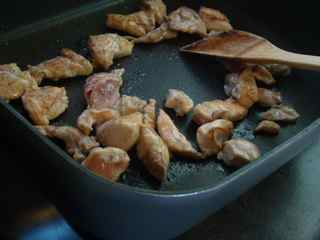Heat the oil in the pan and toss in the chicken pieces. Cook till browned. It does not take long.