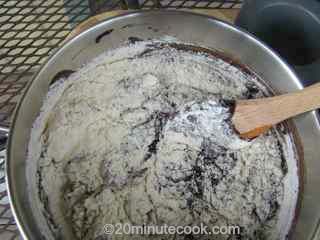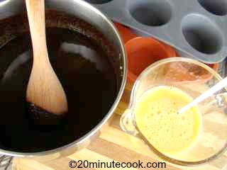 Now, expert cooks throw the lot in...yep, eggs, flour the lot. But here I show you what the mixture looks like when you add the beaten eggs. |