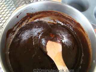 Just look at the beautifully smooth chocolate mixture. It's just divine. This is when the eggs are mixed in - the texture is a little thicker and slickly smooth. |