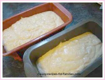 Pour the batter into two loaf "tins". You can see I use flexible non-stick silicone bake ware. I thoroughly recommend these as it saves so much time, not having to line and grease your pans.