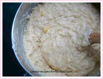 In this picture, you'll see the added beaten eggs and bananas. It looks like a horrific mess, but as you stir, the bananas will bread up and blend into the batter.