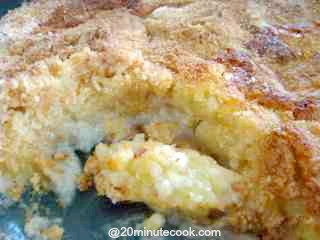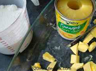Preheat the oven to 420F/ 200C Pop the butter into an oven proof dish and cut it up into small pieces with a blunt knife Pour over the contents of the can of pineapple including the juices In a measuring jug, measure the dry ingredients in the one jug, one after the other. Use the back of a blunt knife to mix well the ingredients Pour loosely over the pineapple pieces. Bake for 15 to 20 minutes till golden brown.