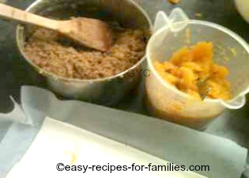 In the meantime, if you're using freshly cooked pumpkin, stew the pumpkin pieces in sugared water.
